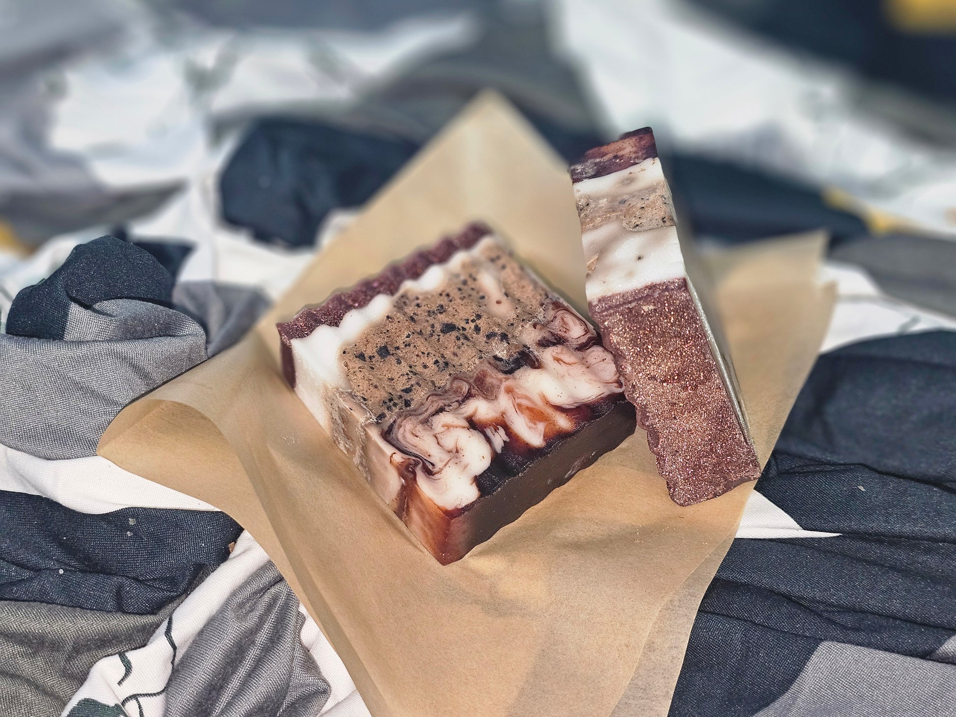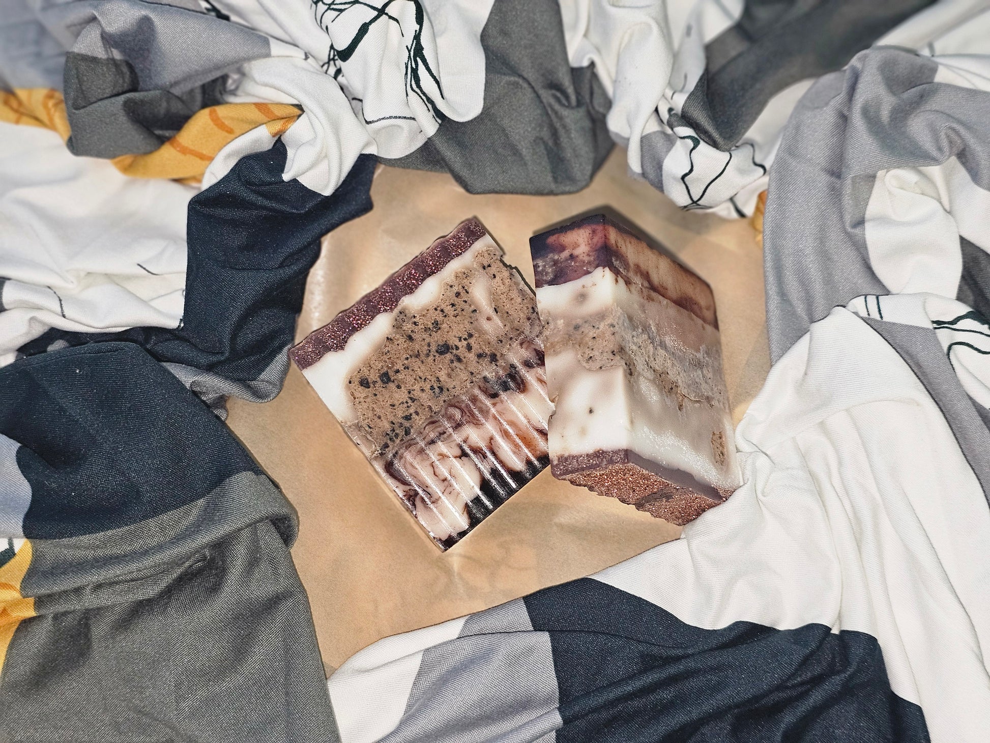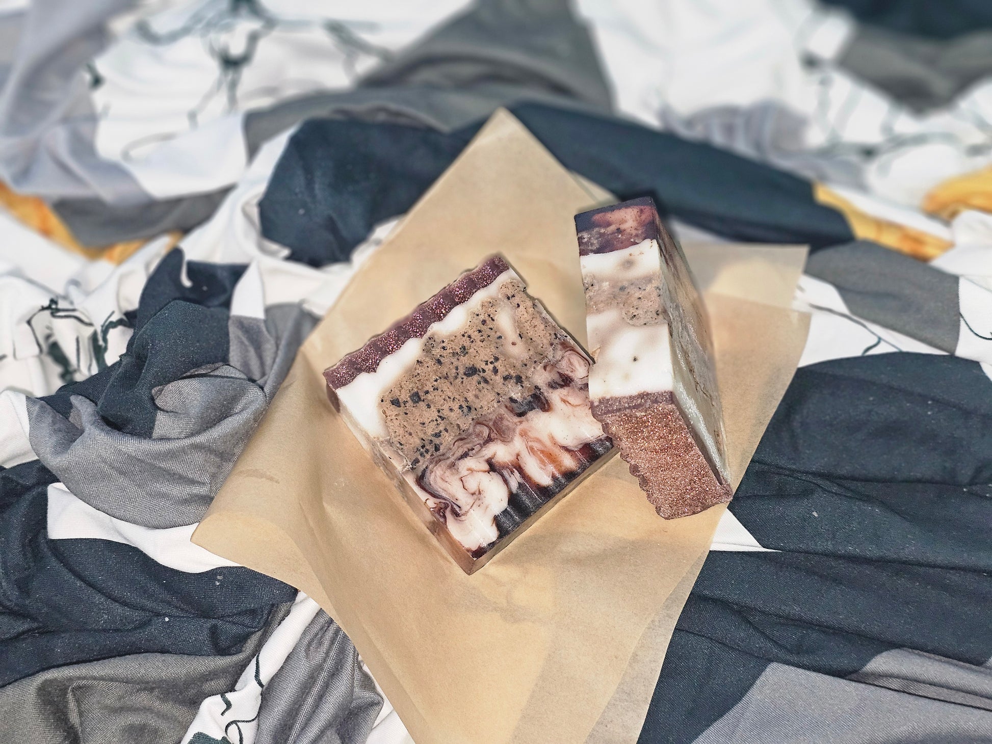 White Layer: Birthday Cake Begin your bathing ritual with the delightful aroma of a perfectly baked birthday cake. The top white layer of Bad & Boujee Soap transports you to a place of joy and celebration, enveloping your skin in a delectable, sweet scent that lingers long after your shower ends. This rich layer nourishes and hydrates, leaving your skin feeling soft and pampered. Middle Layer: Coffee Infused Whipped Soap Sandwiched between the layers of birthday cake and oatmeal stout is our luxurious coffee-infused whipped soap. This unique middle layer delivers a creamy, velvety lather that gently exfoliates and stimulates circulation. The invigorating coffee aroma awakens your senses, providing an energizing start to your day. Brown Layer: Oatmeal Stout The bottom brown layer adds a robust twist with the warm, comforting scent of oatmeal stout. This layer is packed with skin-loving ingredients that soothe and protect, while the rich, malty fragrance offers a grounding and calming end to your bathing experience. Perfect for unwindingafter a long day, it ensures that your skin feels cleansed and rejuvenated.